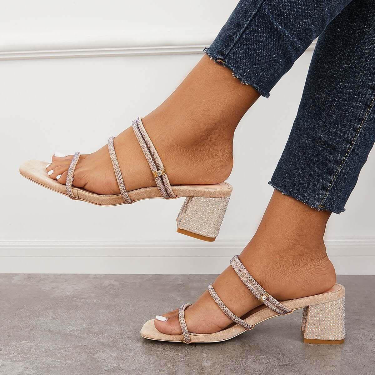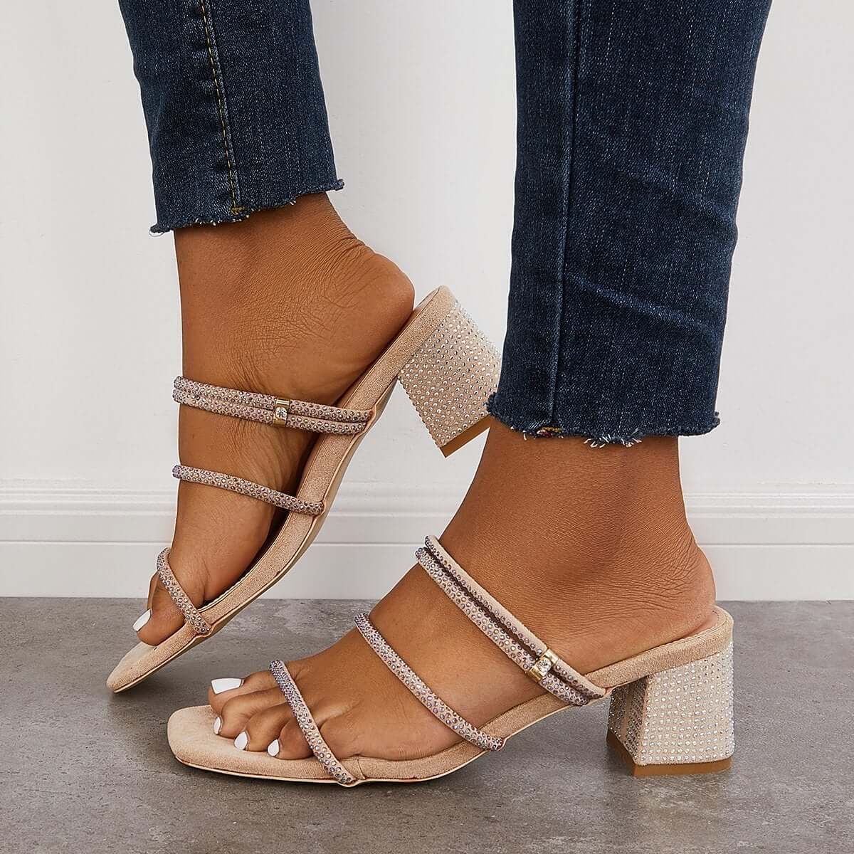 Rhinestone Chunky Heel Mules Slip on Backless Sandals