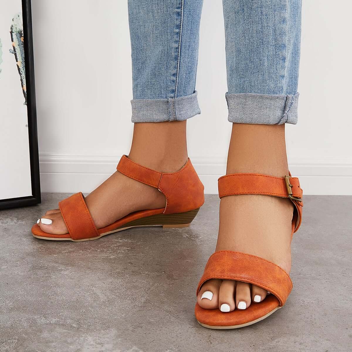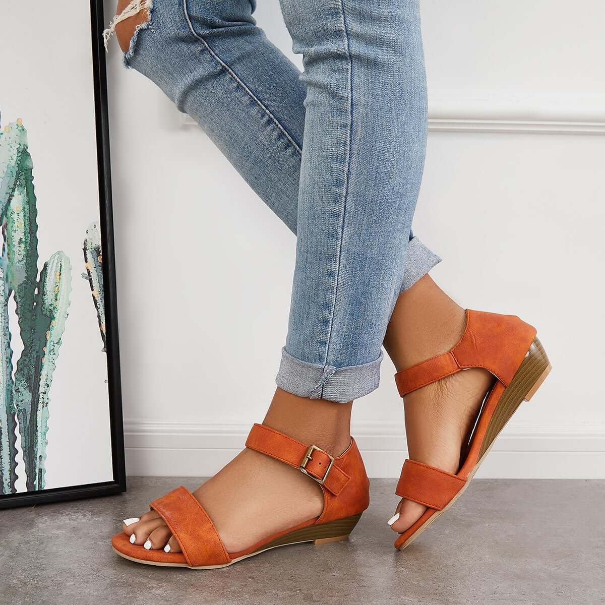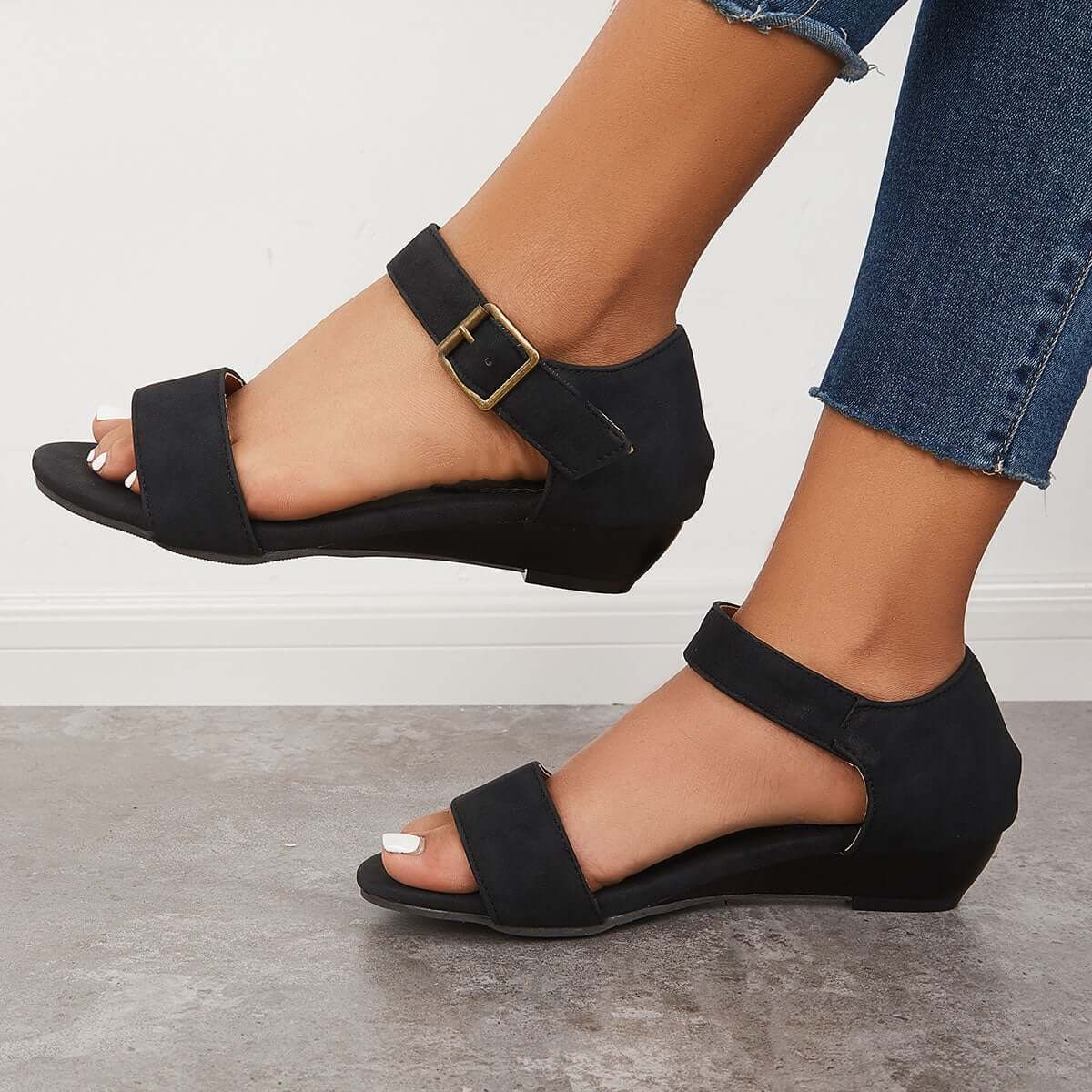 Black Open Toe Low Heels Wedge Ankle Strap Sandals