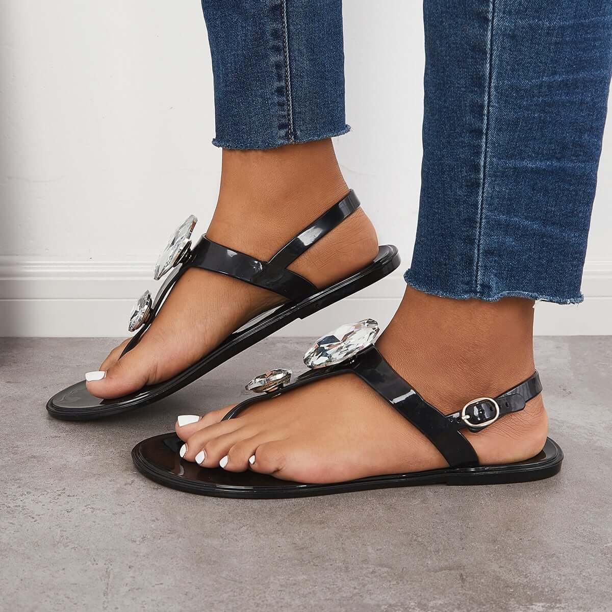 - Flat sandals are inlaid with sparkling artificial rhinestone. The classic bohemian style, comfortable and non-slip sole, flat heel design makes the shoes light and comfortable.