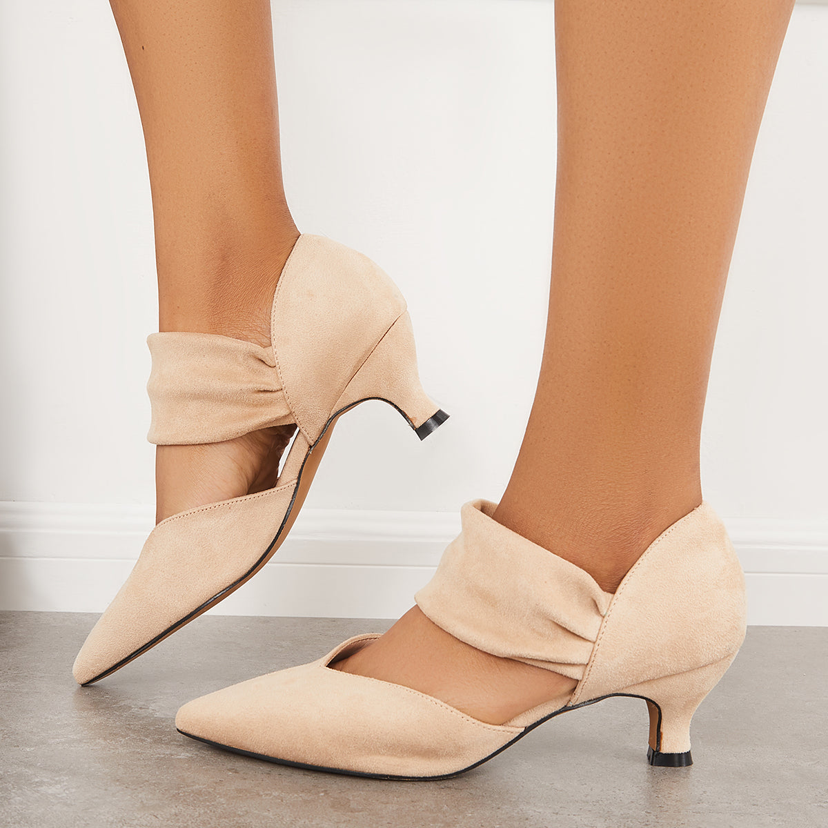 Suede kitten heel pumps designed with a sexy pointed toe,contemporary and wearable low heel, you can wear this low heels in both daily and working days.