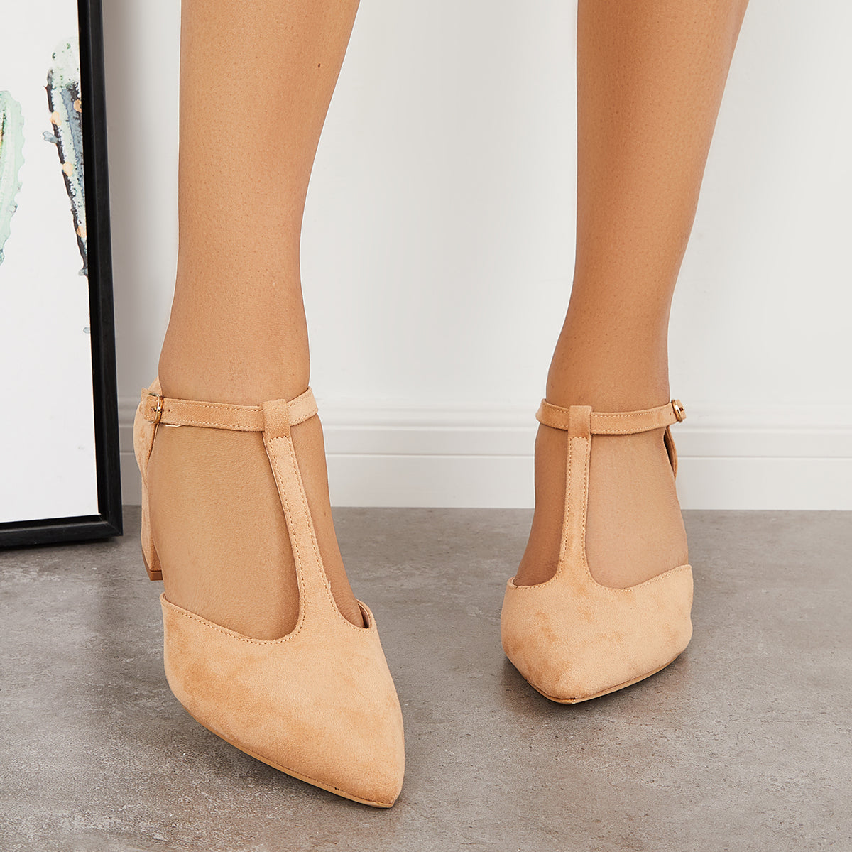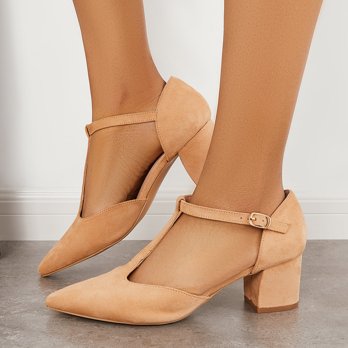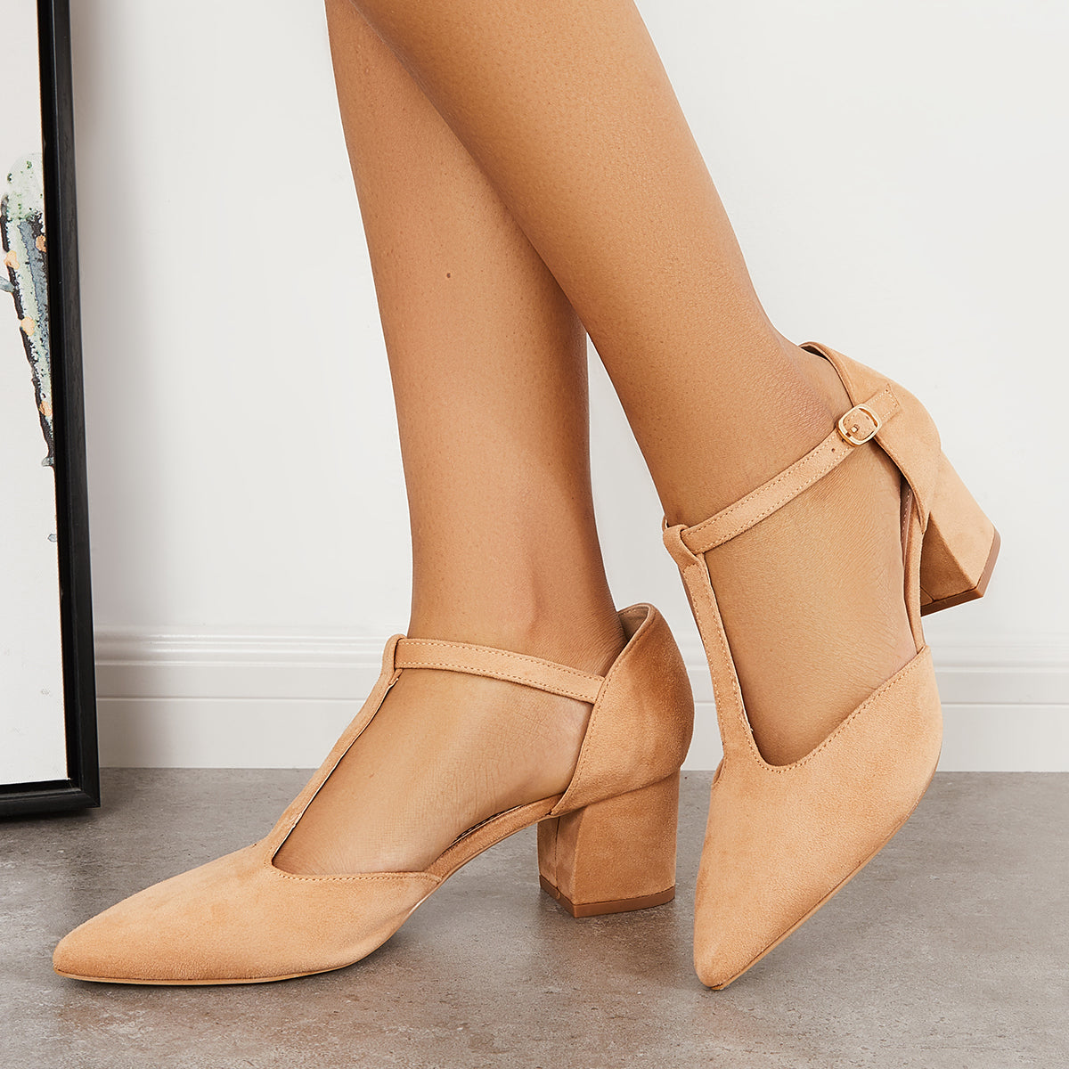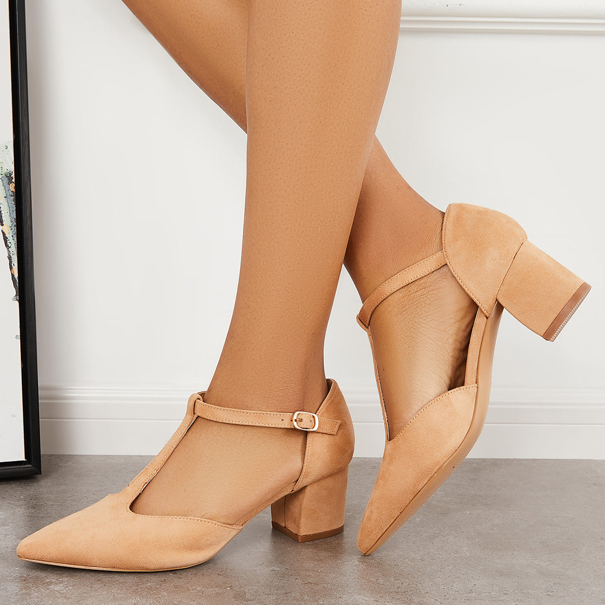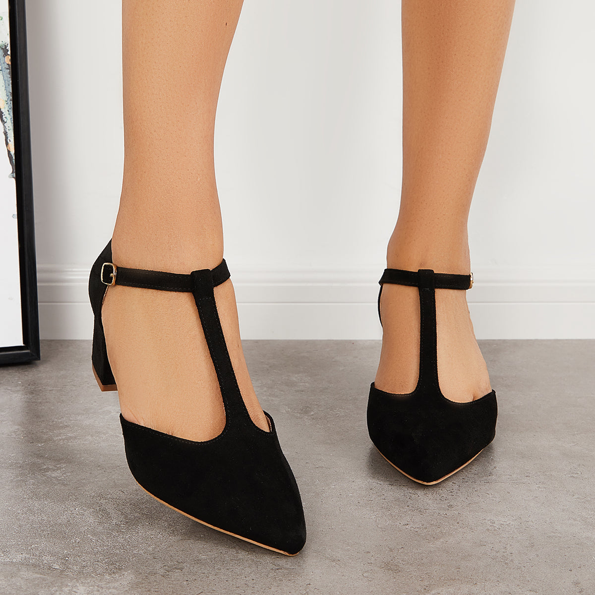 Pointed Toe T-Strap Pumps Ankle Strap Block Heel Shoes