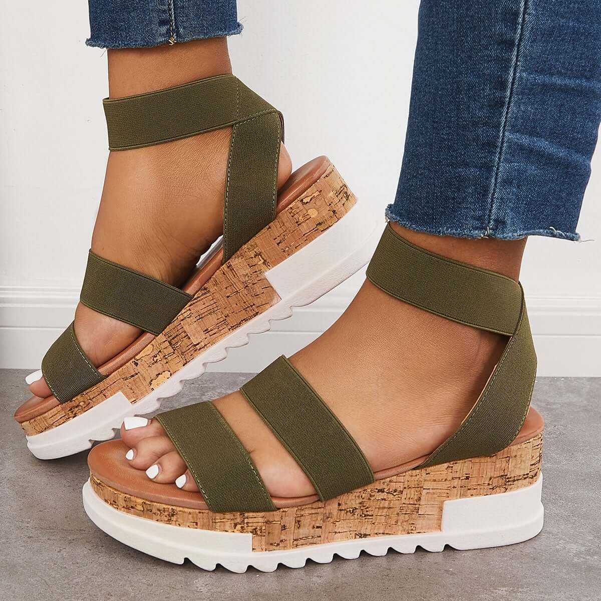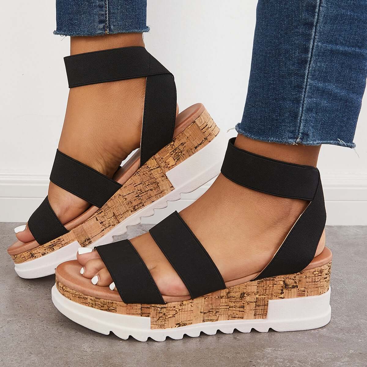 Open Toe Cork Platform Wedges Slip on Elastic Strap Sandals