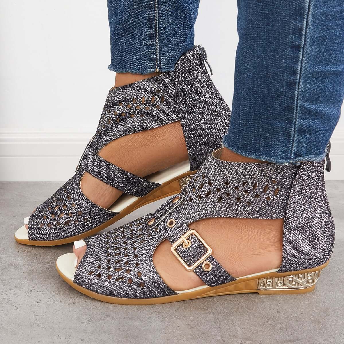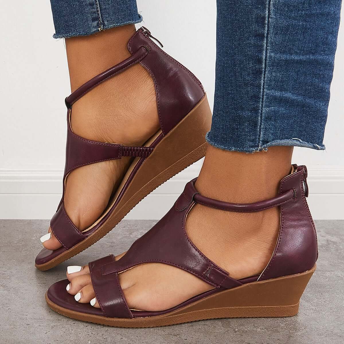 Casual T-Strap Low Wedge Sandals Back Zipper Ankle Strap Shoes