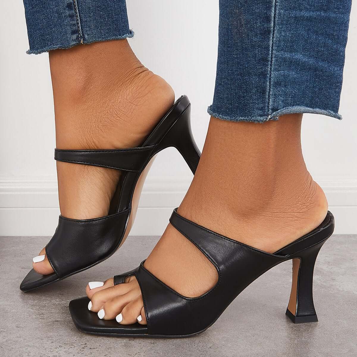 Square Toe Ring Slip on Mule Heels Dress Sandals