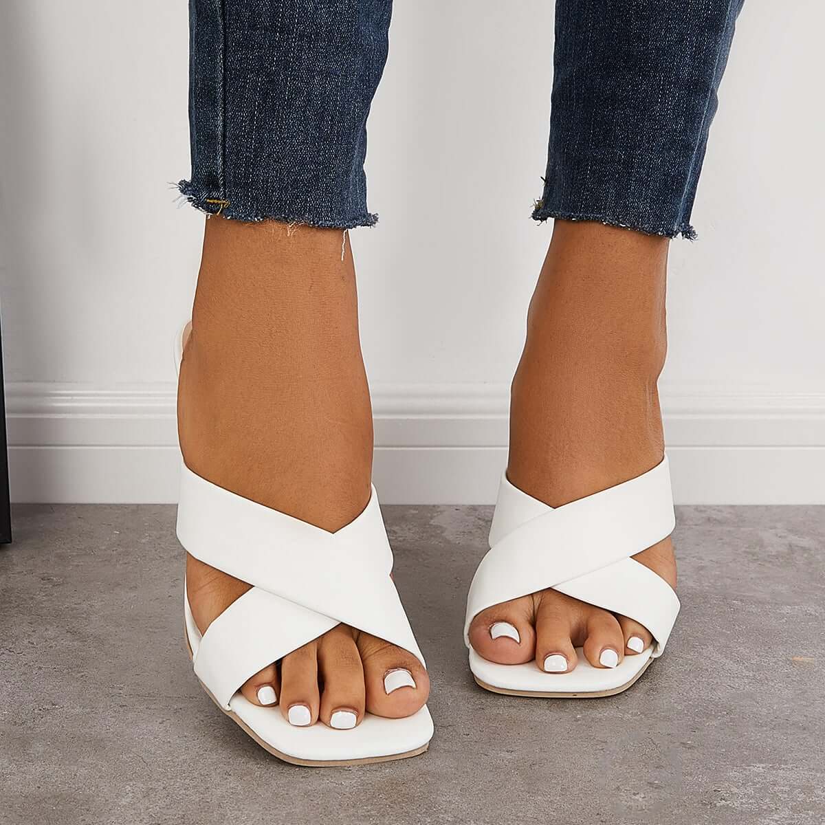 Square Toe Cross Slip On Mid Heel Slipper Dress Sandals